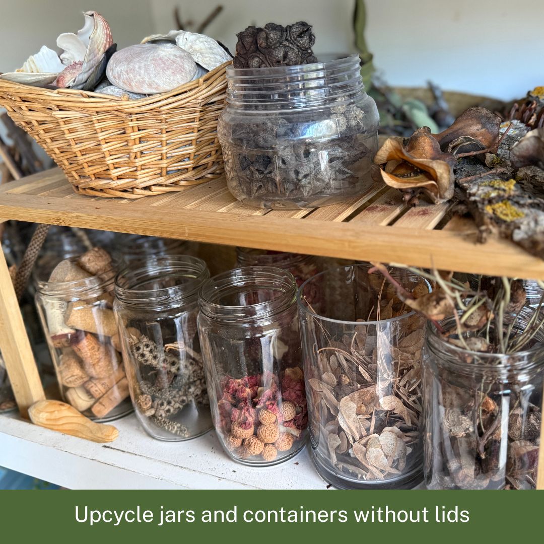 First, don't hide your nature treasures away. Keep them in clear glass or plastic jars - preferably without lids. This way you'll be able to see what's inside and be inspired! Little hands will also be able to access it easily without grown up input - yay for empowering our kids :)